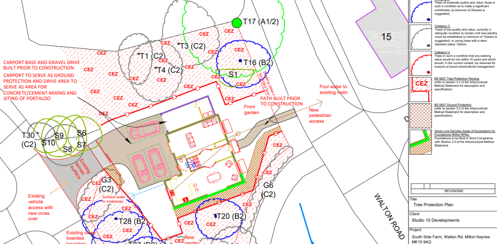 Where impacts at may harm the tree have been identified, a tree protection strategy in the form of an arboricultural method statement can be produced to address the potential impacts. This may simply be protective fencing or more complex measures such as how a new road is built of a building founded. This should be illustrated on a tree protection plan. It will be this document that the builders must fully implement and adhere to during the development. Failure to do can lead to enforcement action such as Stop Notices and court action.
